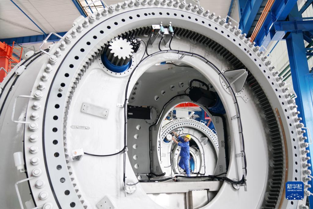 在黑龍江省齊齊哈爾市中國一重集團(tuán)有限公司風(fēng)電裝備生產(chǎn)制造廠生產(chǎn)車間,工人進(jìn)行生產(chǎn)作業(yè)(2021年7月1日攝)。