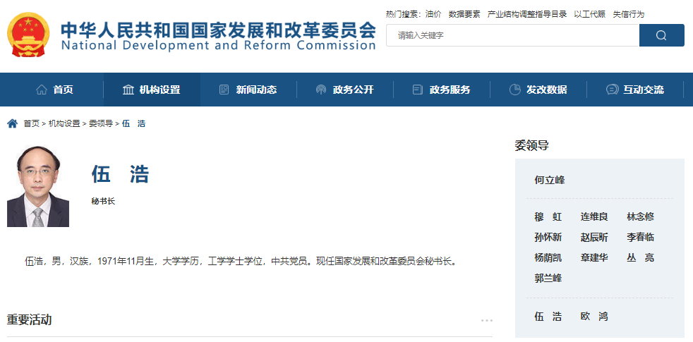 據(jù)國(guó)家發(fā)改委官方網(wǎng)站“委領(lǐng)導(dǎo)”欄目最新名單顯示,伍浩已任國(guó)家發(fā)改委秘書(shū)長(zhǎng)。