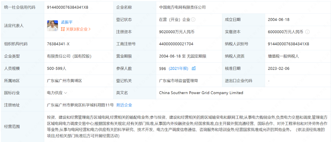 2月6日,中國南方電網有限責任公司發(fā)生工商變更。