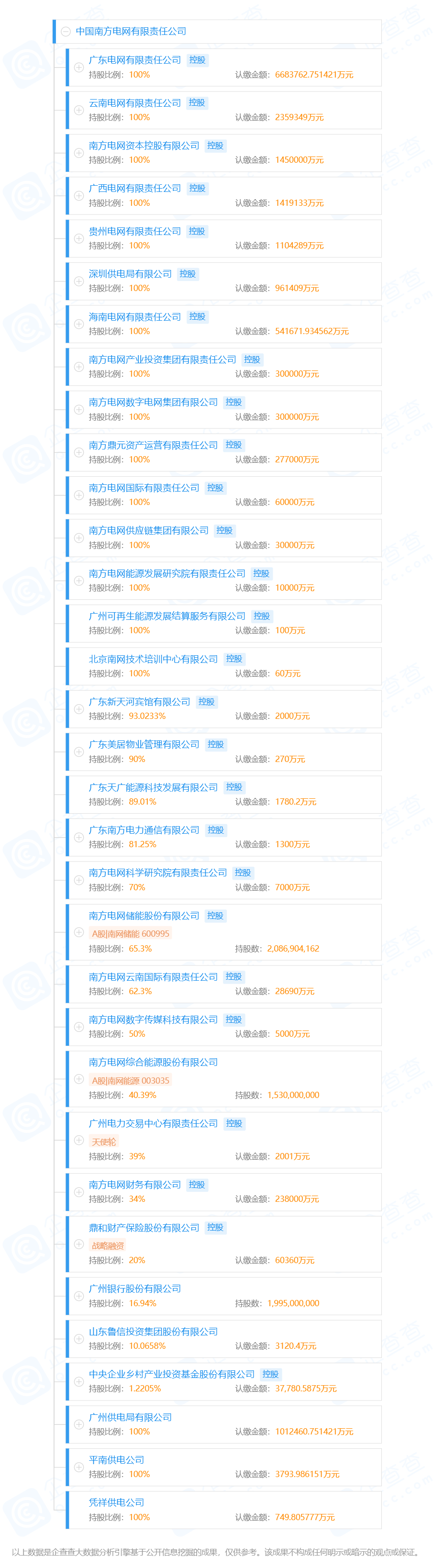 南方電網對外投資控股33家企業(yè),如下圖所示。