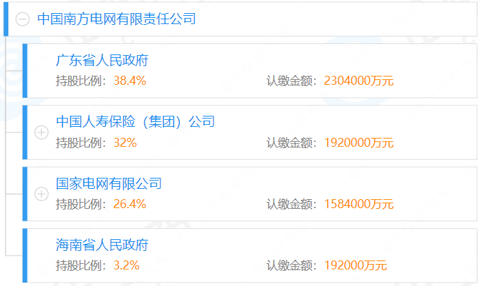 此時南方電網的股權結構為:廣東和海南省政府分別以本省電網資產作為出資;國家電網公司則以云南、貴州、廣西三省(區(qū))電網資產出資,共同組建了南方電網公司。當時的股權結構為廣東省國資委持股70.4%,國家電網公司持股26.4%,海南省政府持股3.2%。
