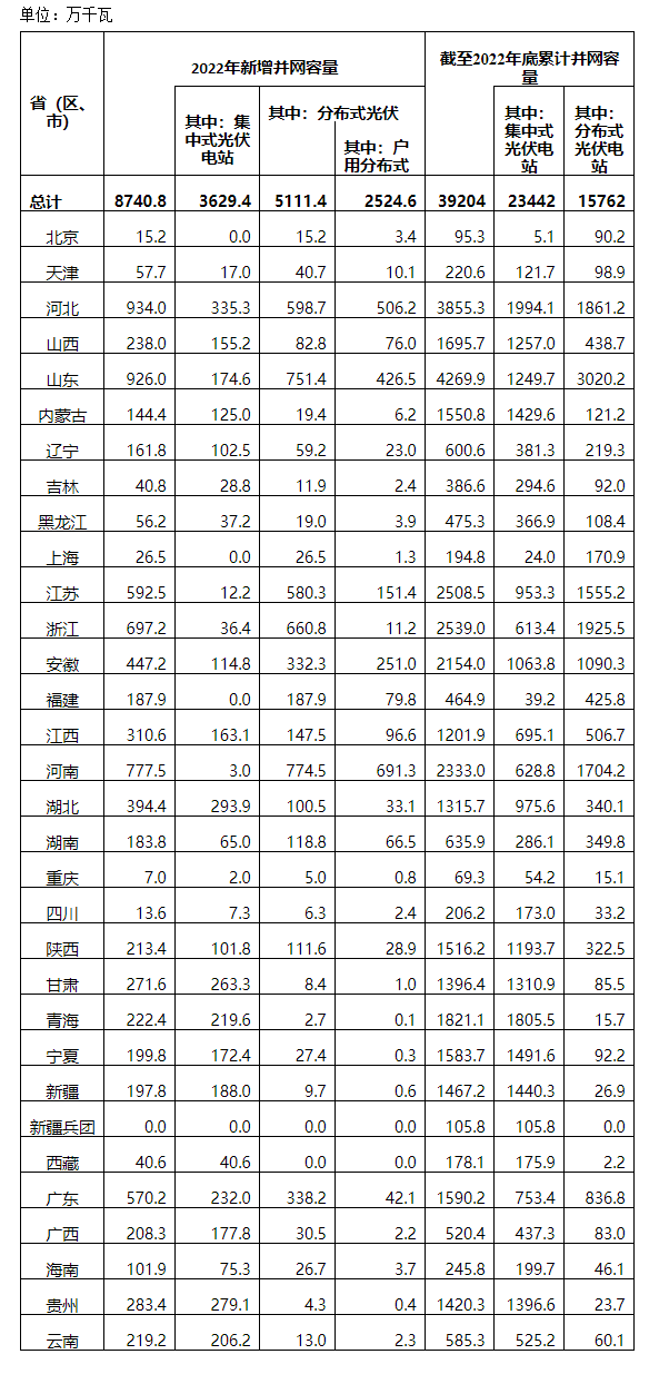 3.2022年部分省(自治區(qū)、直轄市)裝機有退運減容,截至2022年底累計并網(wǎng)容量按當(dāng)年凈增并網(wǎng)容量統(tǒng)計。