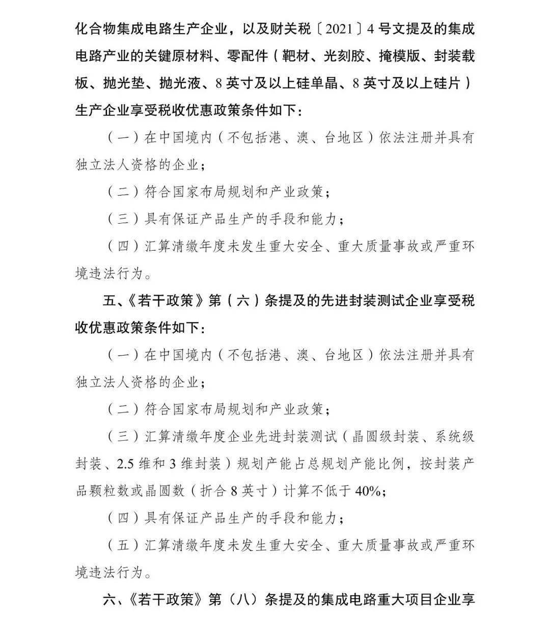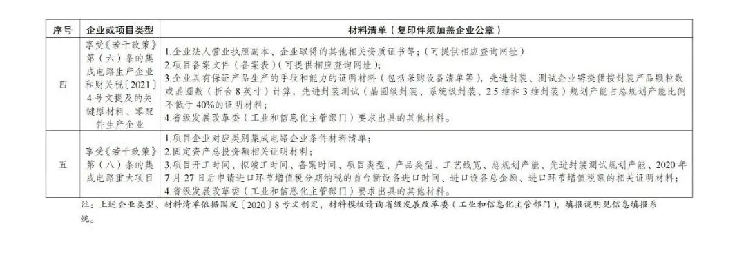 三、地方發(fā)改和工信部門根據(jù)企業(yè)條件和項目標準(附后),對企業(yè)申報的信息進行初核通過后,報送至國家發(fā)展改革委、工業(yè)和信息化部?!度舾烧摺返?一)、(三)、(六)、(七)條,以及財關稅〔2021〕4號文提及的集成電路產(chǎn)業(yè)的關鍵原材料、零配件生產(chǎn)企業(yè)清單,由國家發(fā)展改革委、工業(yè)和信息化部、財政部、海關總署、稅務總局進行聯(lián)審確認并聯(lián)合印發(fā)。《若干政策》第(八)條提及的集成電路重大項目,由國家發(fā)展改革委、工業(yè)和信息化部形成清單后函告財政部,財政部會同海關總署、稅務總局最終確定。