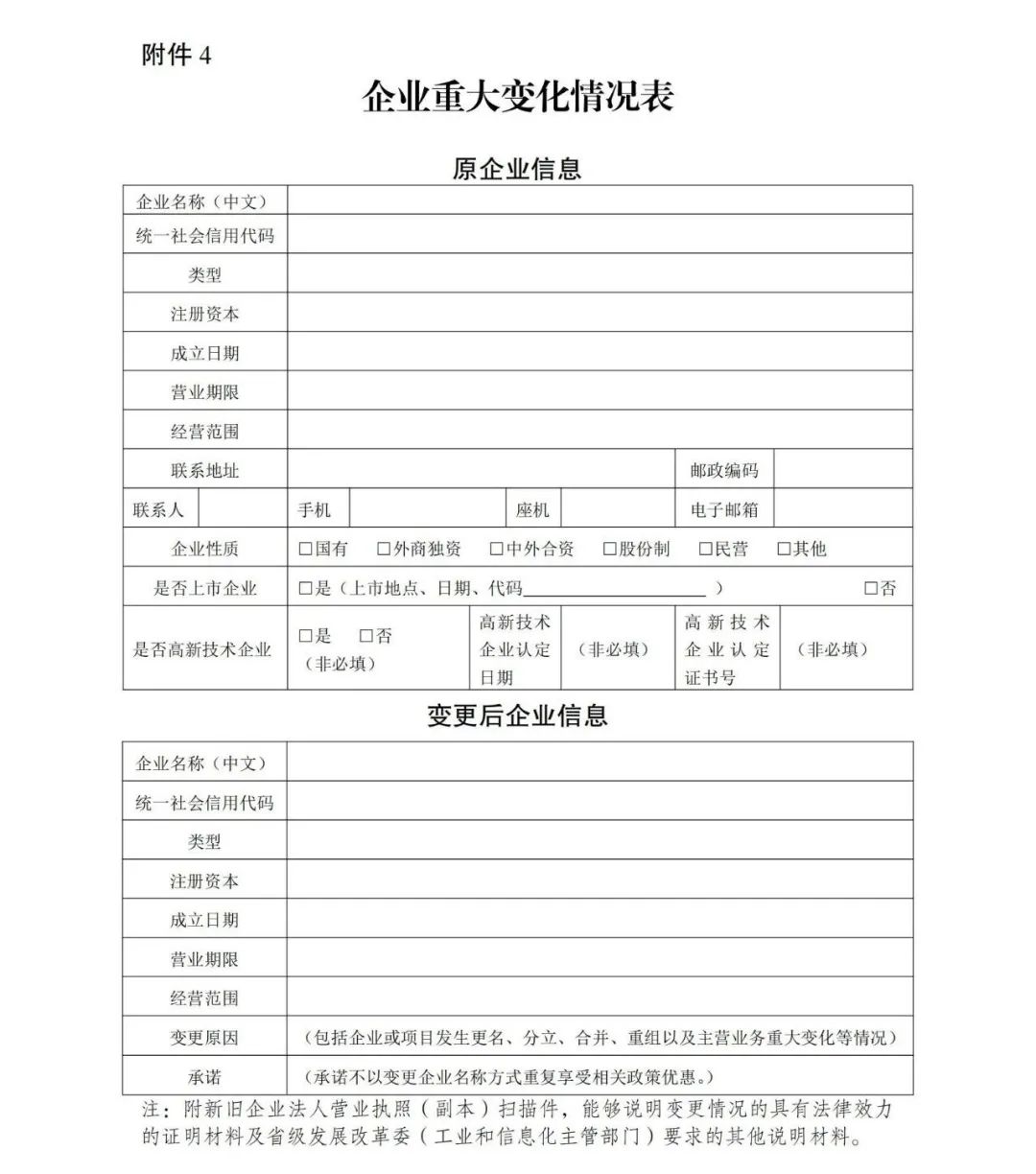 五、已享受《若干政策》第(一)、(三)、(六)、(七)條,以及財關稅〔2021〕4號文提及的關稅優(yōu)惠政策的企業(yè)或項目發(fā)生更名、分立、合并、重組以及主營業(yè)務重大變化等情況,應及時向地方發(fā)改和工信部門報告,并于完成變更登記之日起60日內(nèi),將企業(yè)重大變化情況表和相關材料報送國家發(fā)展改革委、工業(yè)和信息化部(以省級部門上報文件落款日為準)。國家發(fā)展改革委、工業(yè)和信息化部會同相關部門確定發(fā)生變更情形后是否繼續(xù)符合享受優(yōu)惠政策的企業(yè)條件或項目標準。