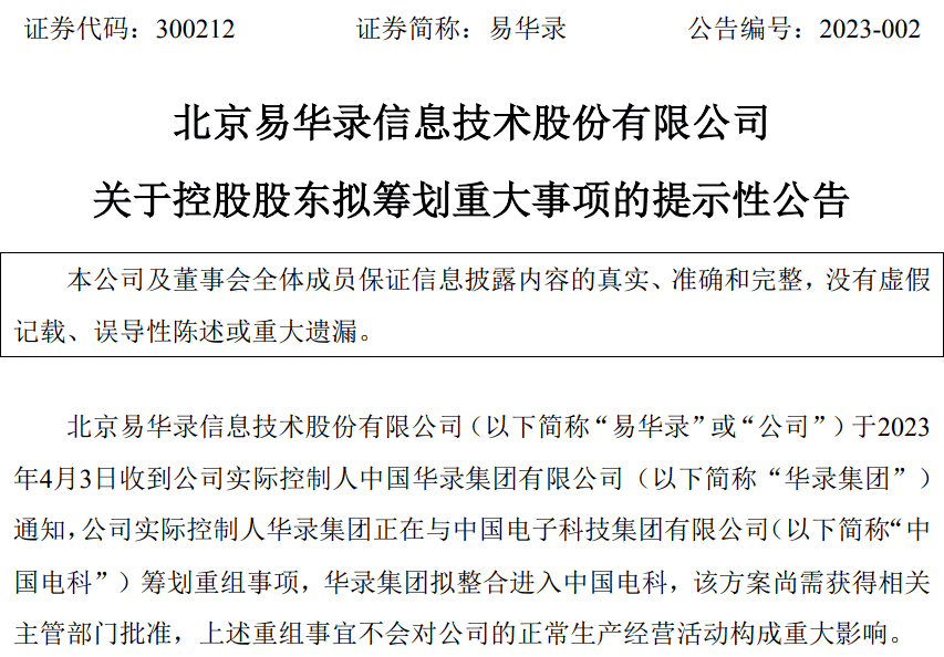 4月3日,北京易華錄信息技術(shù)股份有限公司發(fā)布公告稱,收到公司實(shí)際控制人中國華錄集團(tuán)有限公司(以下簡稱“華錄集團(tuán)”)通知,華錄集團(tuán)正在與中國電子科技集團(tuán)有限公司(以下簡稱“中國電科”)籌劃重組事項(xiàng),華錄集團(tuán)擬整合進(jìn)入中國電科。易華錄表示,該方案尚需獲得相關(guān)主管部門批準(zhǔn),上述重組事宜不會對公司的正常生產(chǎn)經(jīng)營活動構(gòu)成重大影響。公司將按照法律法規(guī)的要求及時(shí)披露進(jìn)展情況。