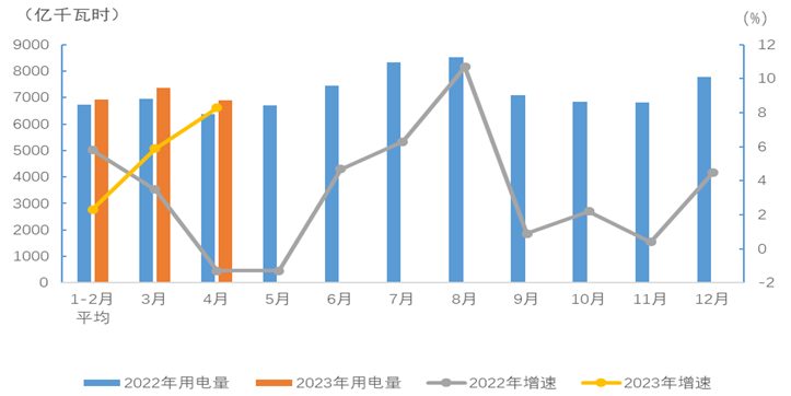 圖4 2022、2023年重點(diǎn)行業(yè)分月用電量情況