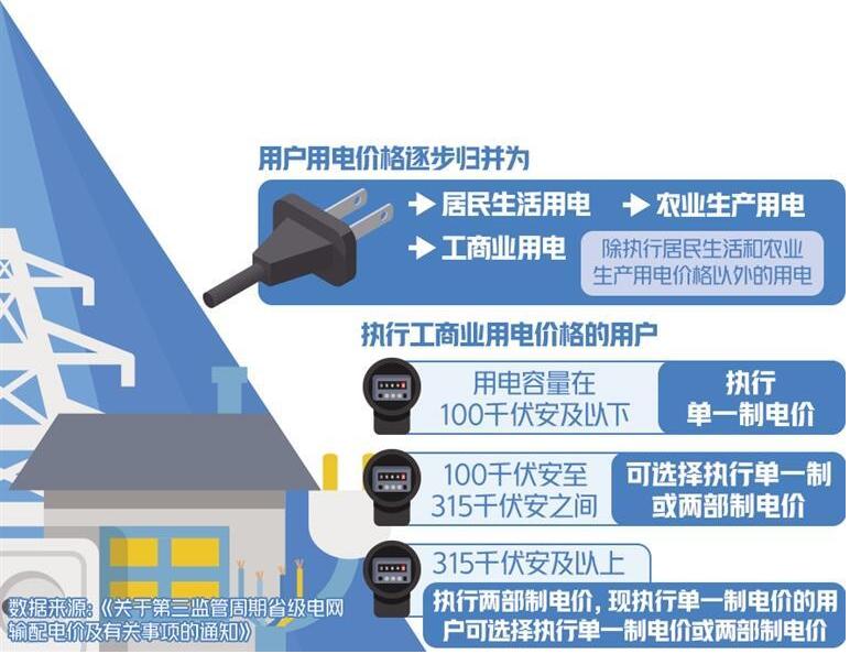 《通知》提出,執(zhí)行工商業(yè)用電價格的用戶,用電容量在100千伏安及以下的,執(zhí)行單一制電價;100千伏安至315千伏安之間的,可選擇執(zhí)行單一制或兩部制電價;315千伏安及以上的,執(zhí)行兩部制電價,現(xiàn)執(zhí)行單一制電價的用戶可選擇執(zhí)行單一制電價或兩部制電價。
