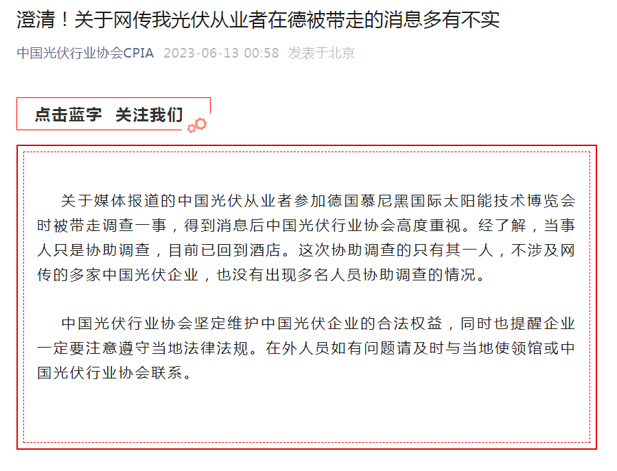據(jù)“中國光伏行業(yè)協(xié)會CPIA”微信公眾號13日消息,關(guān)于媒體報(bào)道的中國光伏從業(yè)者參加德國慕尼黑國際太陽能技術(shù)博覽會時(shí)被帶走調(diào)查一事,得到消息后中國光伏行業(yè)協(xié)會高度重視。經(jīng)了解,當(dāng)事人只是協(xié)助調(diào)查,目前已回到酒店。這次協(xié)助調(diào)查的只有其一人,不涉及網(wǎng)傳的多家中國光伏企業(yè),也沒有出現(xiàn)多名人員協(xié)助調(diào)查的情況。