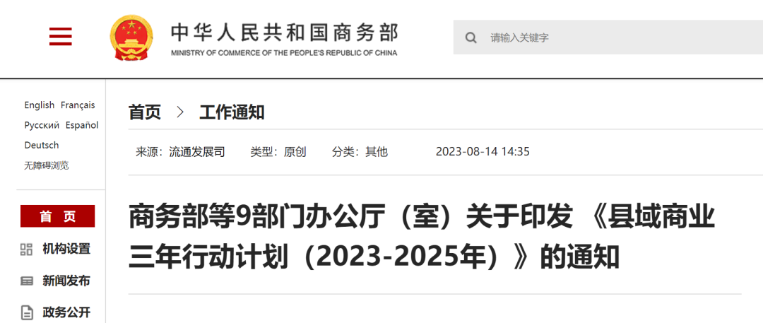 8月14日,商務(wù)部等9部門(mén)辦公廳(室)發(fā)布關(guān)于印發(fā) 《縣域商業(yè)三年行動(dòng)計(jì)劃(2023-2025年)》(以下簡(jiǎn)稱(chēng)《計(jì)劃》)的通知。