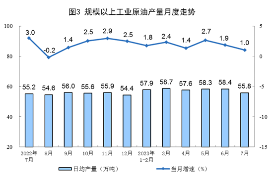 原油產(chǎn)量小幅增加,進(jìn)口保持較快增長(zhǎng)。7月份,生產(chǎn)原油1731萬噸,同比增長(zhǎng)1.0%,增速比6月份放緩0.9個(gè)百分點(diǎn),日均產(chǎn)量55.8萬噸。進(jìn)口原油4369萬噸,同比增長(zhǎng)17.0%,增速比6月份回落28.4個(gè)百分點(diǎn)。