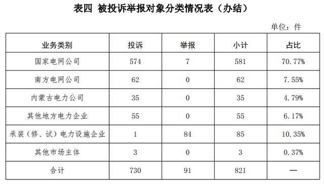 從被投訴舉報對象看,供電企業(yè)733件、占投訴舉報總數的89.28%,其中國家電網公司581件、占比70.77%,南方電網公司62件、占比7.55%,內蒙古電力公司35件、占比3.65%,其他地方電力企業(yè)55件、占比6.17%;承裝(修、試)電力設施企業(yè)85件、占比10.35%;其他市場主體3件、占比0.37%。