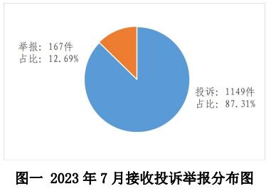 2023年7月,12398熱線共接收投訴舉報1316件,環(huán)比增長39.70%、同比下降27.01%。其中:投訴1149件,環(huán)比增長41.85%、同比下降33.66%;舉報167件,環(huán)比增長26.52%、同比增長135.21%。