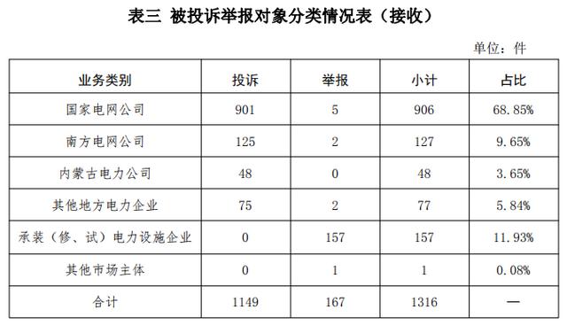 供電企業(yè)1158件、占投訴舉報總數的87.99%,其中國家電網公司906件、占投訴舉報總數的68.85%,南方電網公司127件、占投訴舉報總數的9.65%,內蒙古電力公司48件、占投訴舉報總數的3.65%,其他地方電力企業(yè)77件、占投訴舉報總數的5.84%;承裝(修、試)電力設施企業(yè)157件、占投訴舉報總數的11.93%;其他市場主體1件、占投訴舉報總數的0.08%。