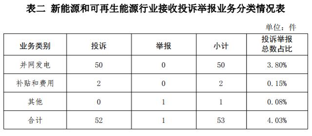 新能源和可再生能源行業(yè)排在第二位,數量為53件、占投訴舉報總數的4.03%,主要集中在并網發(fā)電、補貼和費用等方面。