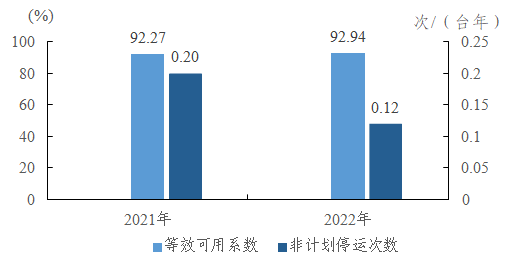 2022年輸變電設(shè)施運行可靠性指標(biāo)總體位置在較高水平,十三類輸變電設(shè)施的可用系數(shù)保持在99.45%以上,強迫停運率維持在0.3次/百千米(臺、套、段)年以下。