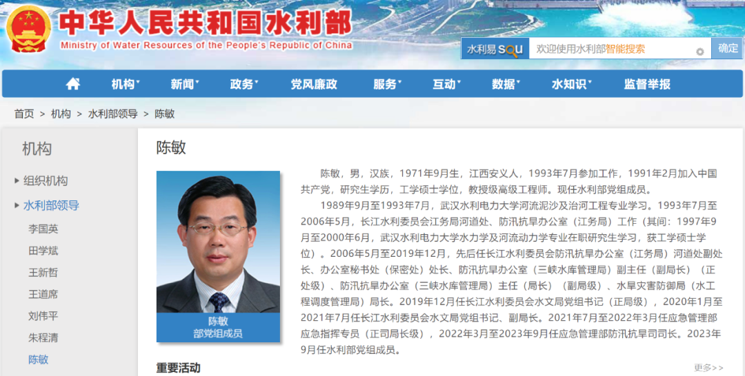 官網(wǎng)顯示,陳敏,男,漢族,1971年9月生,江西安義人,1993年7月參加工作,1991年2月加入中國共產(chǎn)黨,研究生學(xué)歷,工學(xué)碩士學(xué)位,教授級高級工程師?,F(xiàn)任水利部黨組成員。
