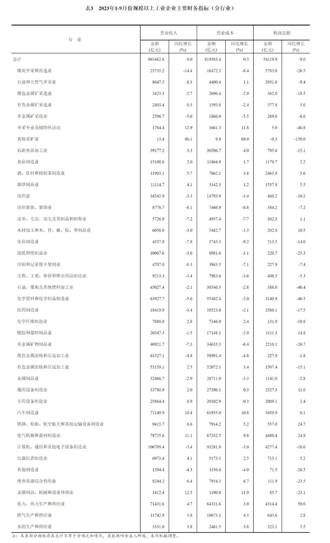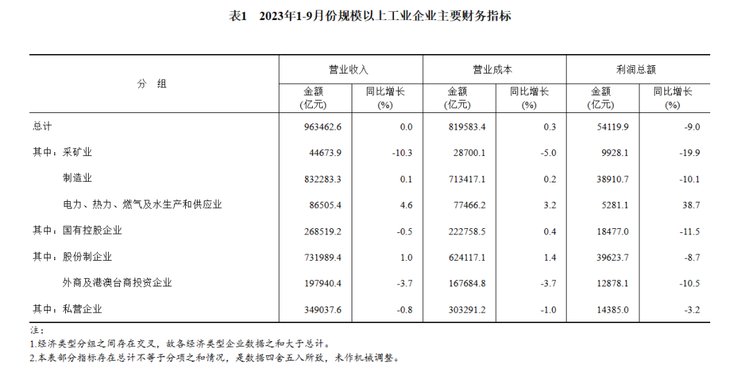 1—9月份,全國規(guī)模以上工業(yè)企業(yè)實(shí)現(xiàn)利潤總額54119.9億元,同比下降9.0%,降幅比1—8月份收窄2.7個(gè)百分點(diǎn)(按可比口徑計(jì)算,詳見附注二)。