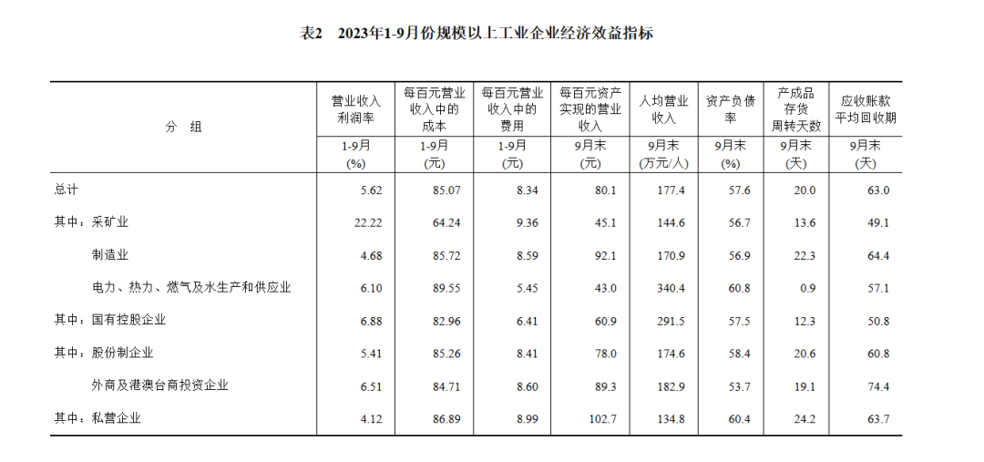9月末,規(guī)模以上工業(yè)企業(yè)每百元資產(chǎn)實(shí)現(xiàn)的營業(yè)收入為80.1元,同比減少5.8元;人均營業(yè)收入為177.4萬元,同比增加6.0萬元;產(chǎn)成品存貨周轉(zhuǎn)天數(shù)為20.0天,同比增加1.2天;應(yīng)收賬款平均回收期為63.0天,同比增加5.9天。