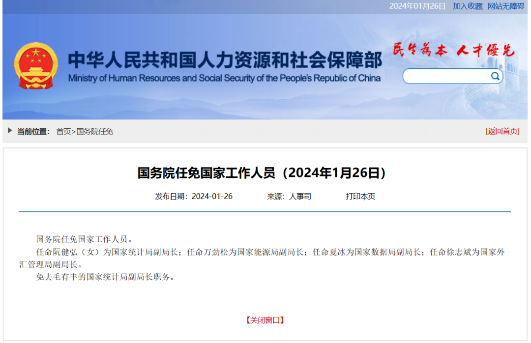 任命阮健弘(女)為國(guó)家統(tǒng)計(jì)局副局長(zhǎng);任命萬勁松為國(guó)家能源局副局長(zhǎng);任命夏冰為國(guó)家數(shù)據(jù)局副局長(zhǎng);任命徐志斌為國(guó)家外匯管理局副局長(zhǎng)。