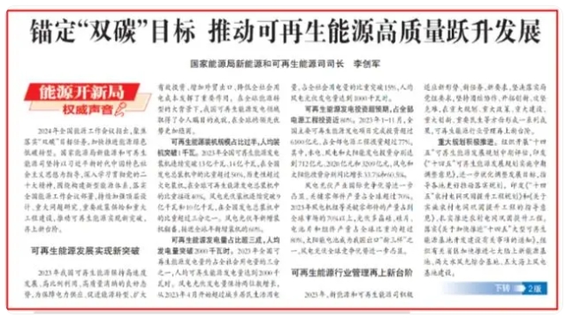 文章指出,2024年是實現(xiàn)“十四五”規(guī)劃目標(biāo)任務(wù)的關(guān)鍵一年。隨著市場競爭更加充分、技術(shù)不斷進(jìn)步,特別是黨中央高度重視,新能源和可再生能源將繼續(xù)保持高速發(fā)展態(tài)勢。新的一年,要按照穩(wěn)中求進(jìn)、以進(jìn)促穩(wěn)、先立后破的工作總基調(diào),堅持陸海并進(jìn)、集散并舉、多能互補(bǔ)、融合發(fā)展,持續(xù)推進(jìn)可再生能源高質(zhì)量躍升發(fā)展。