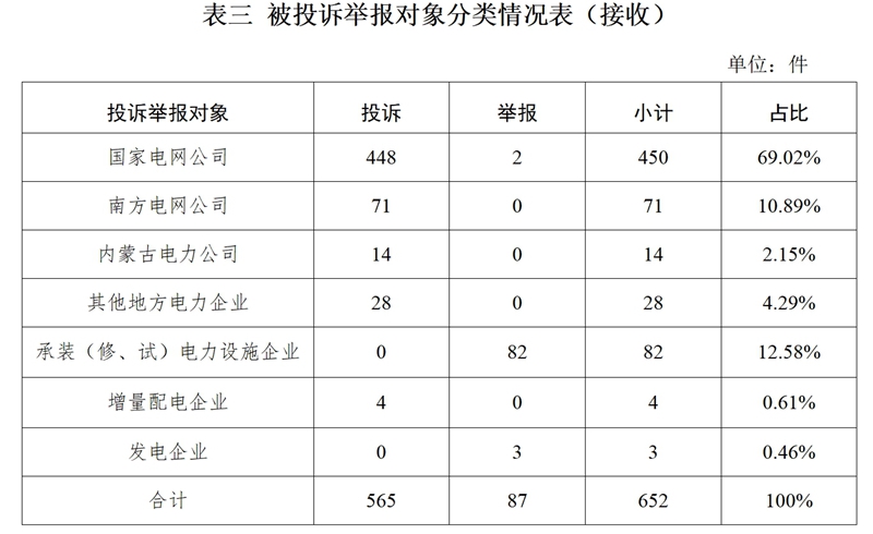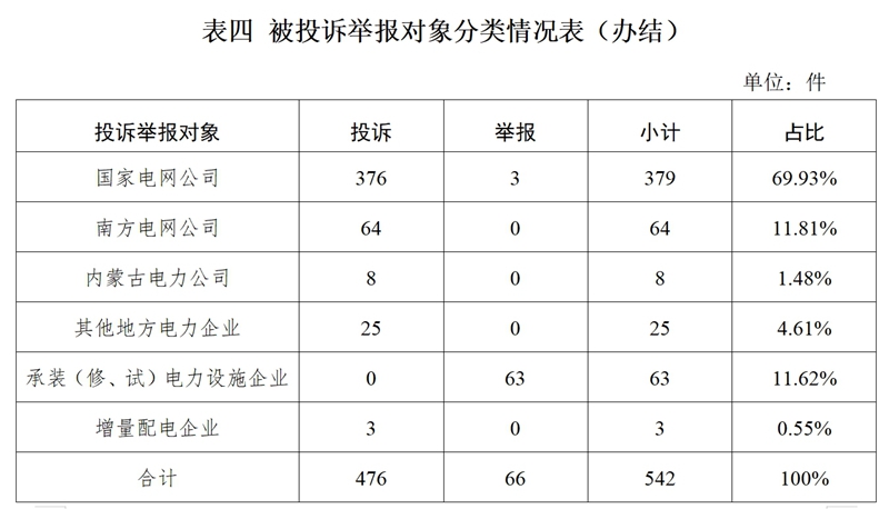 從被投訴舉報(bào)對(duì)象看,供電企業(yè)478件、占投訴舉報(bào)總數(shù)的88.37%,其中:國家電網(wǎng)公司379件、占比69.93%;南方電網(wǎng)公司64件、占比11.81%;內(nèi)蒙古電力公司8件、占比1.48%;其他地方電力企業(yè)25件、占比4.61%;承裝(修、試)電力設(shè)施企業(yè)63件、占比11.62%;增量配電企業(yè)3件、占比0.55%。