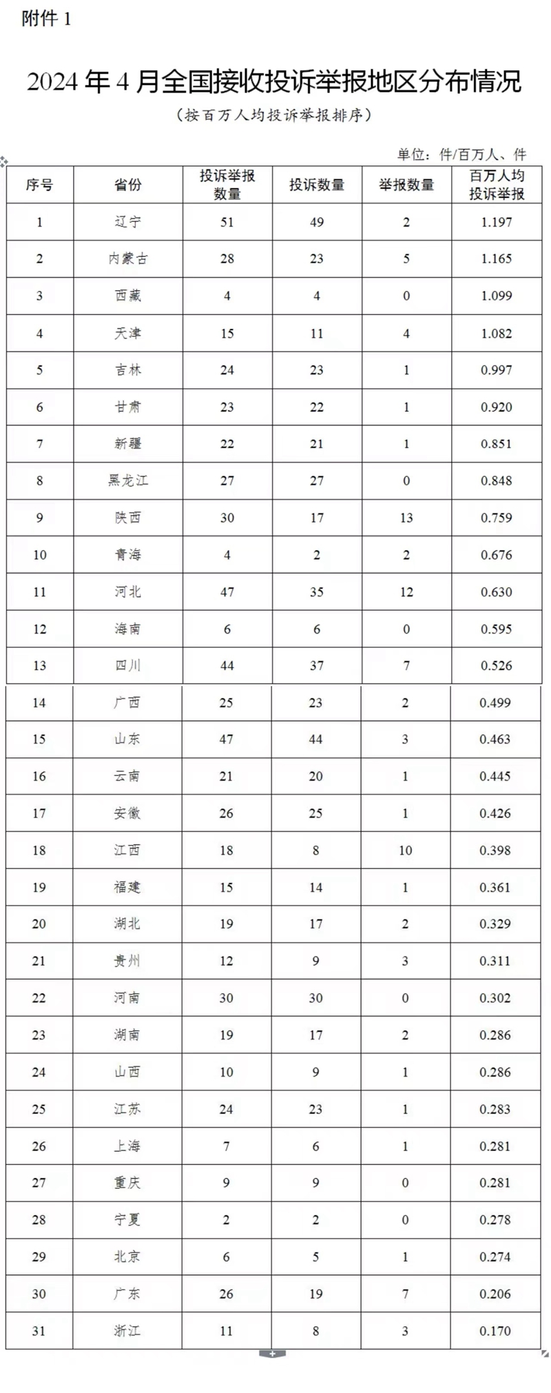 各省(自治區(qū)、直轄市)按照接收投訴舉報(bào)數(shù)量排序,遼寧、河北、山東、四川、河南(與陜西并列)排在全國前5位。按百萬人均投訴舉報(bào)數(shù)量排序,遼寧、內(nèi)蒙古、西藏、天津、吉林排在全國前5位。(2024年4月全國接收投訴舉報(bào)地區(qū)分布情況,見附件1)