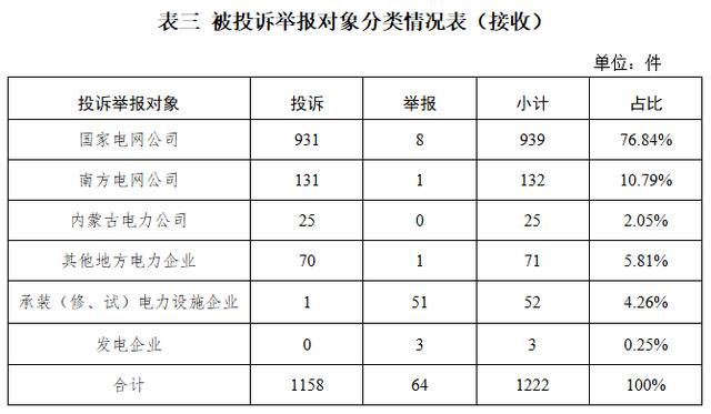 供電企業(yè)1167件、占投訴舉報(bào)總數(shù)的95.49%,其中:國家電網(wǎng)公司939件、占投訴舉報(bào)總數(shù)的76.84%,南方電網(wǎng)公司132件、占投訴舉報(bào)總數(shù)的10.79%,內(nèi)蒙古電力公司25件、占投訴舉報(bào)總數(shù)的2.05%,其他地方電力企業(yè)71件、占投訴舉報(bào)總數(shù)的5.81%;發(fā)電企業(yè)3件,占投訴舉報(bào)總數(shù)的0.25%;承裝(修、試)電力設(shè)施企業(yè)52件、占投訴舉報(bào)總數(shù)的4.26%。