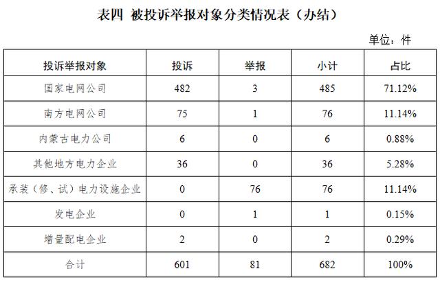 從被投訴舉報(bào)對象看,供電企業(yè)603件、占投訴舉報(bào)總數(shù)的88.42%,其中:國家電網(wǎng)公司485件、占比71.12%;南方電網(wǎng)公司76件、占比11.14%;內(nèi)蒙古電力公司6件、占比0.88%;其他地方電力企業(yè)36件、占比5.28%。承裝(修、試)電力設(shè)施企業(yè)76件、占比11.14%;發(fā)電企業(yè)1件、占比0.15%;增量配電企業(yè)2件、占比0.29%。
