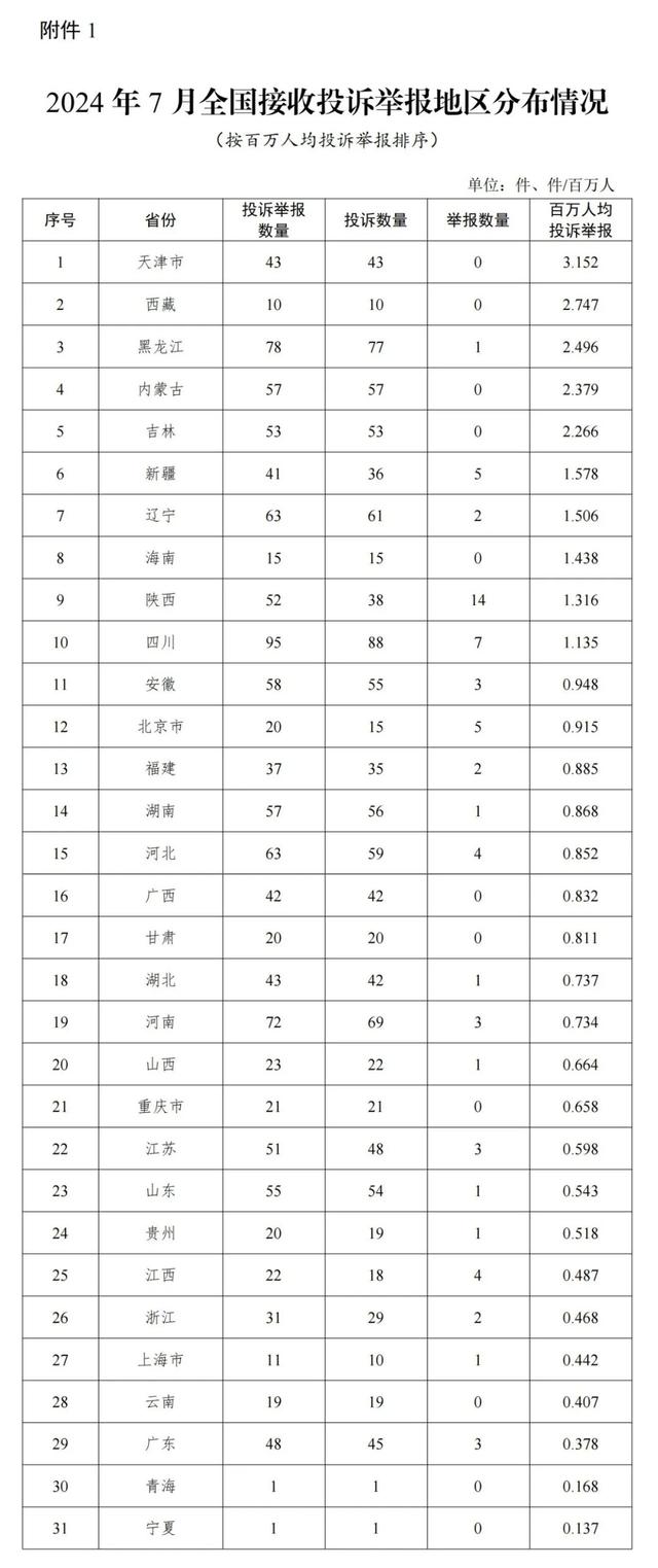 各省(自治區(qū)、直轄市)按照接收投訴舉報(bào)數(shù)量排序,四川、黑龍江、河南、遼寧、安徽排在全國前5位。按百萬人均投訴舉報(bào)數(shù)量排序,天津、西藏、黑龍江、內(nèi)蒙古、吉林排在全國前5位。(2024年7月全國接收投訴舉報(bào)地區(qū)分布情況,見附件1)