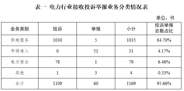 電力行業(yè)排在首位,數(shù)量為1169件、占投訴舉報(bào)總數(shù)的95.66%,主要集中在供電服務(wù)、電力安全、市場準(zhǔn)入等方面。