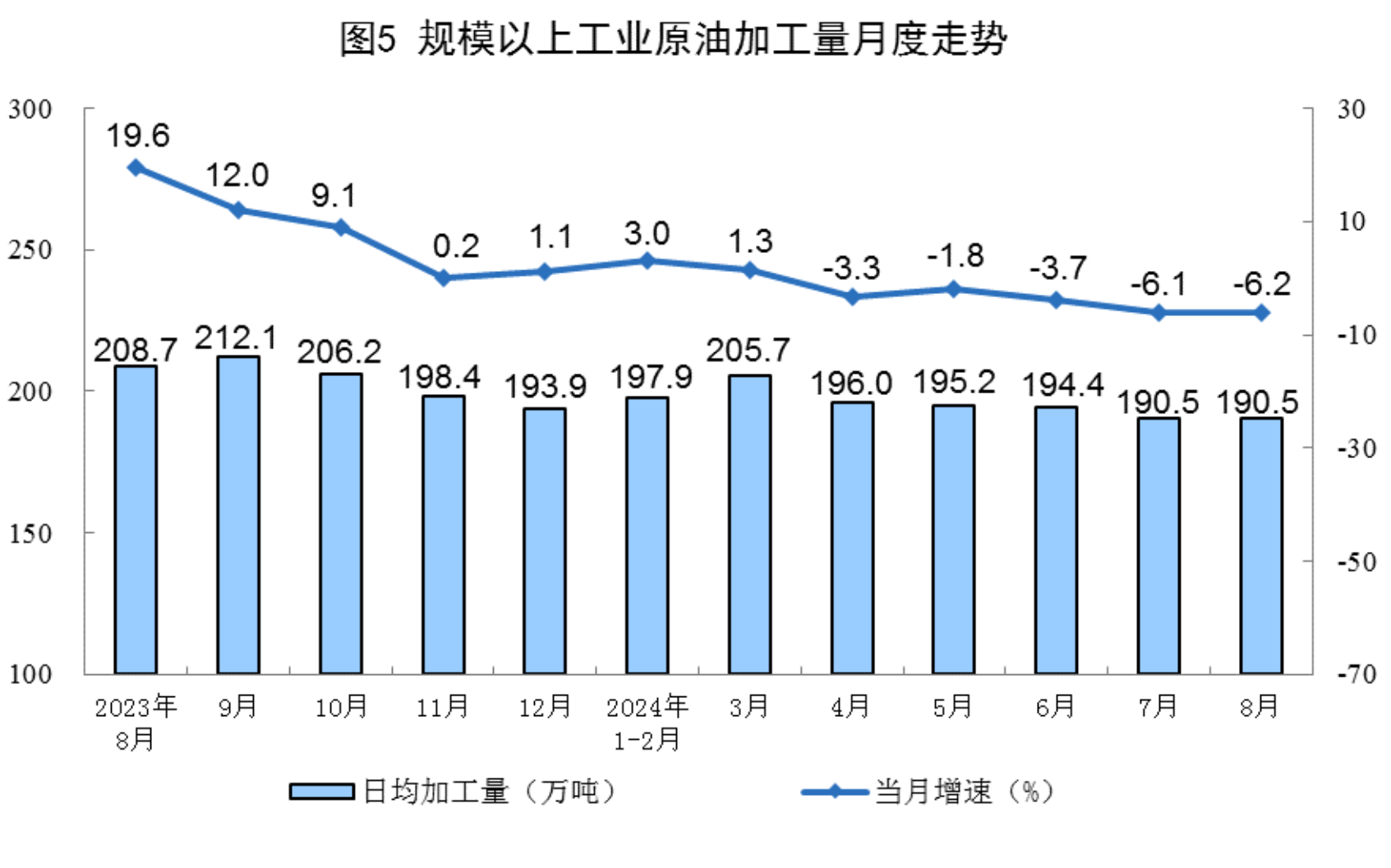 原油加工有所下降。8月份,規(guī)上工業(yè)原油加工量5907萬(wàn)噸,同比下降6.2%;日均加工190.5萬(wàn)噸。1—8月份,規(guī)上工業(yè)原油加工量47253萬(wàn)噸,同比下降1.2%。