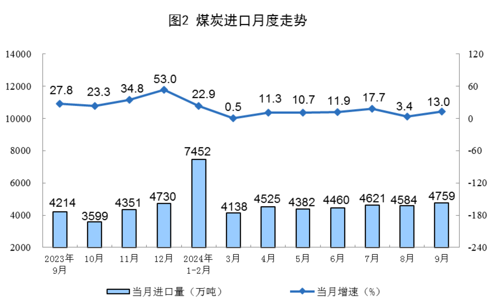 原煤生產(chǎn)增速加快。9月份,規(guī)上工業(yè)原煤產(chǎn)量4.1億噸,同比增長4.4%,增速比8月份加快1.6個百分點;日均產(chǎn)量1381.5萬噸。進(jìn)口煤炭4759萬噸,同比增長13.0%。