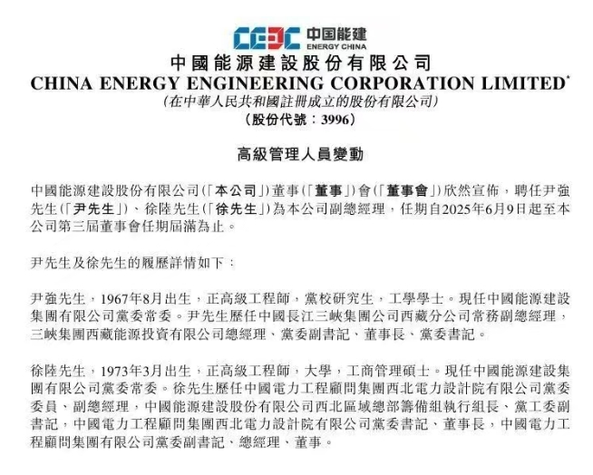 經(jīng)中國能建第三屆董事會提名委員會第十次會議審核和第三屆董事會第四十七次會議審議通過,同意聘任尹強先生、徐陸先生為公司副總經(jīng)理,任期自本次董事會批準(zhǔn)之日起至公司第三屆董事會任期屆滿止。