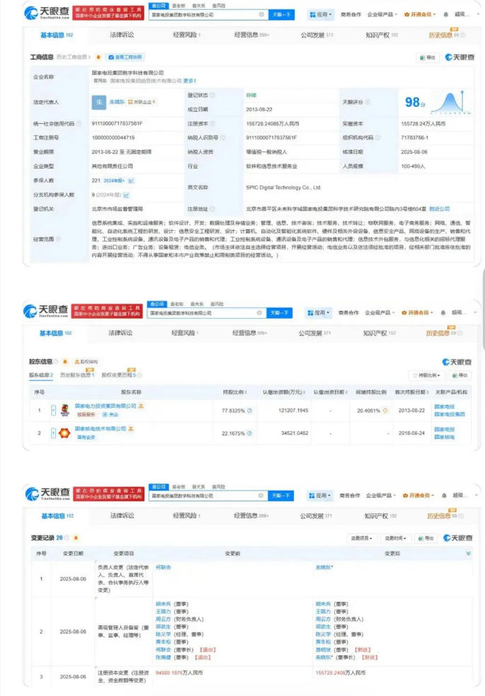 國家電投集團(tuán)數(shù)字科技有限公司成立于2013年8月,經(jīng)營范圍包括信息系統(tǒng)集成、實(shí)施和運(yùn)維服務(wù)等。股東信息顯示,該公司由國家電力投資集團(tuán)有限公司、國家核電技術(shù)有限公司共同持股。