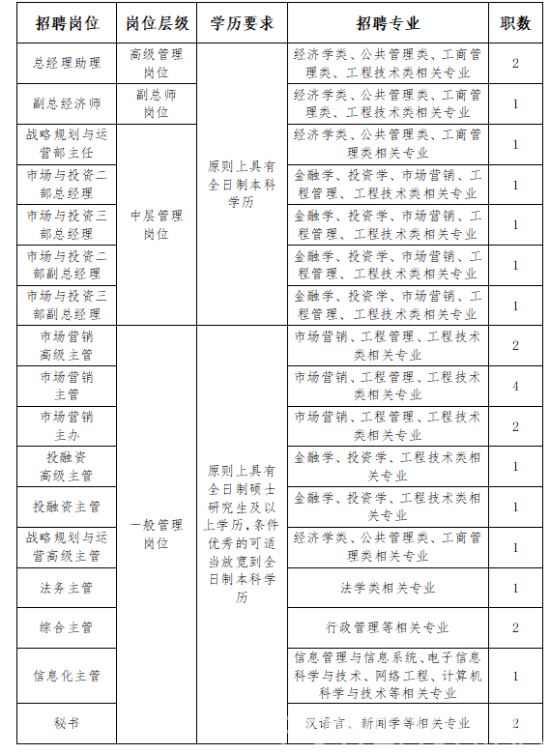 4.主導(dǎo)完成3個(gè)及以上投資金額30億元以上的項(xiàng)目。具備機(jī)關(guān)、事業(yè)單位處級(jí)或國(guó)有企業(yè)相對(duì)應(yīng)層級(jí)崗位工作經(jīng)驗(yàn)的優(yōu)先;