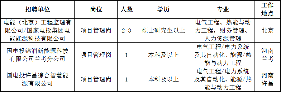 根據(jù)業(yè)務(wù)發(fā)展需要,中國(guó)電能所屬企業(yè)電能(北京)工程監(jiān)理有限公司、國(guó)家電投集團(tuán)電能能源科技有限公司、國(guó)電投錦潤(rùn)新能源科技有限公司蘭考分公司、國(guó)電投許昌綜合智慧能源有限公司面向2023年高校應(yīng)屆畢業(yè)生進(jìn)行公開選聘。