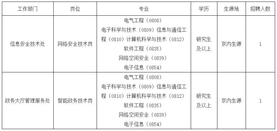 2.政務大廳管理服務處:智能政務技術(shù)崗工作人員1名(京內(nèi)生源研究生及以上應屆畢業(yè)生)。專業(yè)為電氣工程(0808)、電子科學與技術(shù)(0809)、信息與通信工程(0810)、計算機科學與技術(shù)(0812)、軟件工程(0835)、網(wǎng)絡空間安全(0839)、電子信息(0854)。要求作風正派、嚴謹細致、踏實肯干,責任心強、執(zhí)行力強、服務意識強,具有較強的溝通協(xié)調(diào)能力和文字功底。