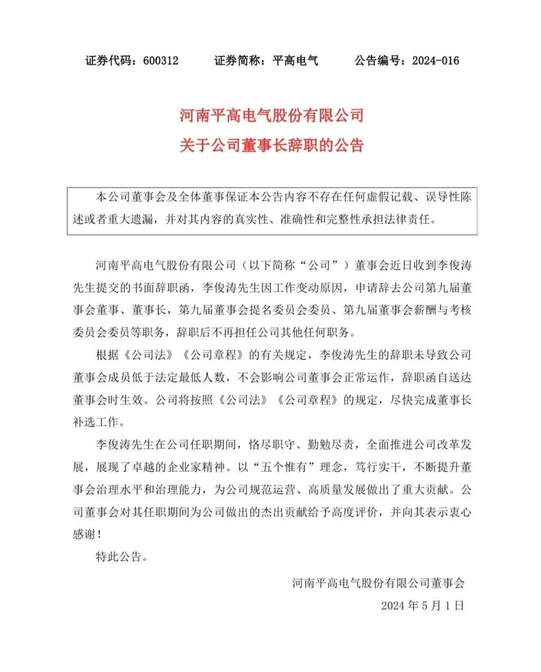 5月1日,平高電氣發(fā)布公告稱,公司董事會近日收到李俊濤先生提交的書面辭職函,李俊濤先生因工作變動原因,申請辭去公司第九屆董事會董事、董事長,第九屆董事會提名委員會委員、第九屆董事會薪酬與考核委員會委員等職務(wù),辭職后不再擔(dān)任公司其他任何職務(wù)。