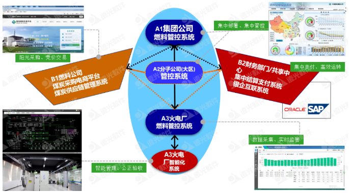 在縱向貫通方面,通過(guò)在集團(tuán)公司總部部署燃料管控信息系統(tǒng),以集中部署、集中管控為實(shí)施原則,發(fā)揮集團(tuán)公司的計(jì)劃管理和實(shí)施監(jiān)督的管理職能。在分(子)公司部署燃料管控系統(tǒng),作為燃料縱向三級(jí)管控中承上啟下的“橋梁”,對(duì)下屬電廠(chǎng)采購(gòu)、入廠(chǎng)、結(jié)算實(shí)施監(jiān)管,同時(shí)進(jìn)行區(qū)域內(nèi)調(diào)控;協(xié)助集團(tuán)公司進(jìn)行保供控價(jià)的執(zhí)行,落實(shí)集團(tuán)對(duì)燃料指標(biāo)管控要求。在電廠(chǎng)部署燃料管控信息系統(tǒng)(A2)與燃料智能化系統(tǒng)(A3),作為燃料管控的執(zhí)行主體,內(nèi)容包括入廠(chǎng)計(jì)量過(guò)程智能化系統(tǒng)、采制樣過(guò)程智能化系統(tǒng)、化驗(yàn)管理網(wǎng)絡(luò)化系統(tǒng)、煤場(chǎng)管理數(shù)字化系統(tǒng)、入爐煤管理系統(tǒng)、門(mén)禁系統(tǒng)、燃料集中監(jiān)控系統(tǒng)和監(jiān)控中心、燃料業(yè)務(wù)管理系統(tǒng)。