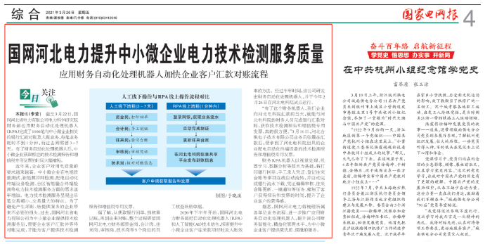 截至3月22日,國網(wǎng)河北省電力有限公司電力科學(xué)研究院財(cái)務(wù)部應(yīng)用財(cái)務(wù)自動(dòng)化處理機(jī)器人(RPA) 完成了1000筆與中小微企業(yè)相關(guān)的銀行匯款對(duì)賬及入賬業(yè)務(wù),每筆業(yè)務(wù)耗時(shí)不到1分鐘,而過去則需要3~7天。有了財(cái)務(wù)自動(dòng)化處理機(jī)器人后,中小微企業(yè)獲取相應(yīng)的技術(shù)檢測(cè)報(bào)告和增值稅專用發(fā)票的時(shí)間大幅縮短。