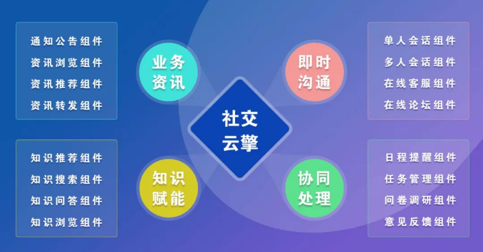 遠(yuǎn)光社交云擎套件,含即時溝通、知識賦能、業(yè)務(wù)資訊、協(xié)同處理四大云擎組件,所有組件能夠與企業(yè)各類業(yè)務(wù)系統(tǒng)深度融合,以人為核心,以高效協(xié)同為根本,改變企業(yè)及組織傳統(tǒng)的互動與信息共享方式,破解業(yè)務(wù)協(xié)同互聯(lián)等難題,實現(xiàn)管理系統(tǒng)融合創(chuàng)新,助力管理快速社交化、智能化升級。