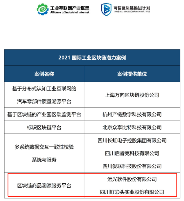 近日,由湖南省工業(yè)和信息化廳主辦的2021國際工業(yè)區(qū)塊鏈大會在長沙順利召開,會上發(fā)布了《2021工業(yè)區(qū)塊鏈案例集》、《工業(yè)區(qū)塊鏈應用指南》、《2021工業(yè)區(qū)塊鏈技術應用及趨勢報告》等重磅成果。憑借在區(qū)塊鏈領域的創(chuàng)新技術能力及應用成果,遠光軟件區(qū)塊鏈商品溯源服務平臺成功入選《2021工業(yè)區(qū)塊鏈案例集》。