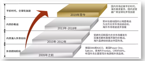 回顧逆變器的發(fā)展歷史,2003年陽(yáng)光電源推出中國(guó)首臺(tái)擁有自主知識(shí)產(chǎn)權(quán)的逆變器。2012年全球出貨量前十中只有陽(yáng)光電源一家中國(guó)企業(yè)。2015年以來(lái),華為、陽(yáng)光電源和SMA的出貨量前三地位穩(wěn)定,而行業(yè)腰部企業(yè)市場(chǎng)份額接近,競(jìng)爭(zhēng)更為激烈。在激烈的角逐中,中國(guó)逆變器企業(yè)逐漸崛起。如今,陽(yáng)光電源、華為等品牌逆變器穩(wěn)扎穩(wěn)打,在國(guó)際站穩(wěn)腳跟。歷經(jīng)激烈競(jìng)爭(zhēng)、行業(yè)迭代,我國(guó)逆變器企業(yè)實(shí)現(xiàn)從無(wú)到有、從有到強(qiáng)的強(qiáng)勢(shì)蛻變。