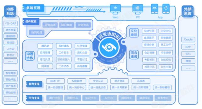 遠光協(xié)同云以移動端協(xié)同為核心,融合內(nèi)外部應(yīng)用,支持企業(yè)以搭積木形式取用文化建設(shè)、溝通協(xié)作、綜合事務(wù)等多類應(yīng)用,為企業(yè)構(gòu)建社交化、移動化、云端化、智能化的協(xié)作創(chuàng)新生態(tài)圈。