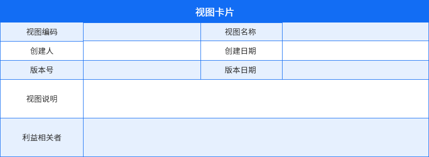 視圖卡片是關(guān)于視圖元信息的描述,通過(guò)視圖卡片可以了解視圖編碼、名稱、版本號(hào)、創(chuàng)建人、視圖描述和視圖的利益相關(guān)者。
