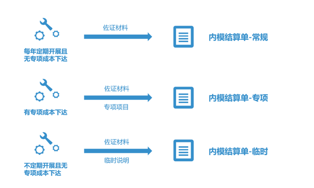 按照業(yè)務(wù)活動(dòng)開展頻率和活動(dòng)開展成本的不同,系統(tǒng)提供三種類型的內(nèi)模結(jié)算單進(jìn)行填報(bào),滿足不同業(yè)務(wù)需求。