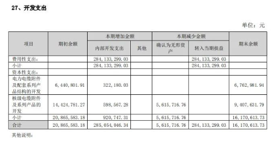 開發(fā)支出方面,費用性支出2841萬元,資本性支出92萬元,包括電力電纜附件及配套系列產(chǎn)品結(jié)構(gòu)的開發(fā)年度支出32萬元,核級電纜附件及系列產(chǎn)品的開發(fā)年度支出60萬元。具體見下表。