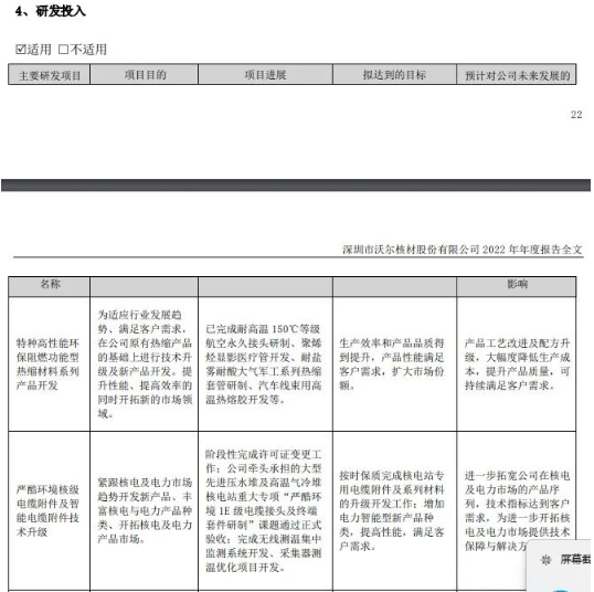 主要研發(fā)項目包括特種高性能環(huán)保阻燃功能型熱縮材料系列產(chǎn)品開發(fā)項目、嚴酷環(huán)境核級電纜附件及智能電纜附件技術(shù)升級項目。具體見下表。