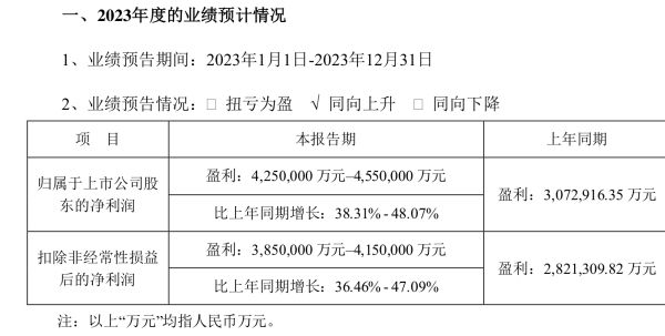1月30日晚間,寧德時(shí)代公告,預(yù)計(jì)2023年歸屬上市股東的凈利潤(rùn)425億元—455億元,同比增長(zhǎng)38.31%—48.07%??鄢墙?jīng)常性損益后的凈利潤(rùn)為385億元—415億元,同比增長(zhǎng)36.46%—47.09%。