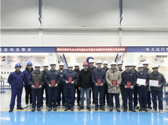 其中,2023年組織國網(wǎng)客戶(包括國網(wǎng)天津市電力公司電纜分公司、國網(wǎng)石家莊供電公司、國網(wǎng)濟南供電公司、國網(wǎng)南昌供電公司、國網(wǎng)保定供電公司、國網(wǎng)鄭州供電公司電纜運檢中心、國網(wǎng)長沙供電公司電纜檢修公司、國網(wǎng)四川省電力公司成都供電公司等)來司開展高壓電纜附件安裝培訓共計9場,參訓學員48人,累計培訓學時584小時;受國網(wǎng)客戶單位邀請開展各類技能比武、安裝技能提升培訓指導服務(wù)共計12次,累計培訓、指導課時418小時。2024年2月底到3月初,為國網(wǎng)天津市電力公司電纜分公司的15名青年職工提供為期5天的專業(yè)培訓。
